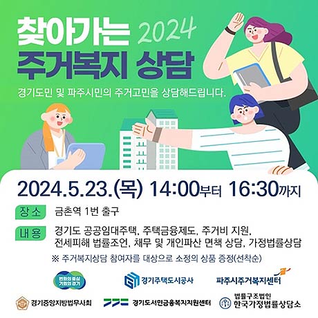 GH, 파주시 주거복지센터, 경기중앙지방법무사회, 경기도 서민금융복지지원센터, 한국가정법률상담소 등 5개 기관들이 상담 협의체를 구성해 ▲경기도 공공임대주택 ▲주택금융제도 ▲주거비 지원 ▲전세피해 법률조언 ▲채무 및 개인파산 면책 상담 ▲가정법률상담 등을 지원한다.