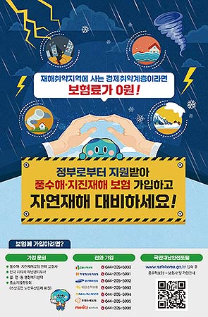 특히, 재해를 입은 이력이 있거나 붕괴위험지역, 산사태위험지역 등 재해취약지역에 거주한다면 일반지역 대비 더 많은 지원을 받아 저렴하게 가입할 수 있고 재해취약지역에 거주하는 경제취약계층의 경우 보험료를 전액 지원 받을 수 있다.