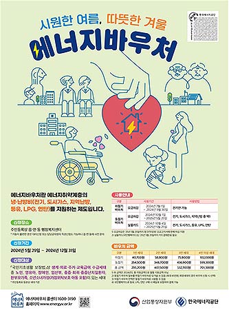 취약계층을 대상으로 에너지비용을 지원해주는 에너지바우처의 ’24년도 사업이 본격 시작된다. 산업통상자원부(장관 안덕근)는 5월 29일(수)부터 12월 31일(화)까지 전국 읍·면·동 행정복지센터와 복지로 홈페이지(www.bokjiro.go.kr)에서 올해 사업의 신청·접수를 진행한다고 밝혔다.