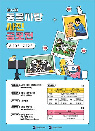 농림축산검역본부(본부장 김정희, 이하 검역본부)는 동물의 보호‧복지에 대한 성숙하고 친근한 문화를 확산하기 위해 일반 국민을 대상으로 「제17회 동물사랑 사진 공모전」을 개최한다.