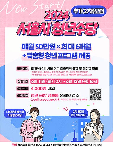 서울시가 취업을 준비하는 청년들이 생활비 걱정 없이 진로 탐색과 취업 준비에 집중할 수 있도록 지원하는 ‘청년수당’ 참여자 4천여 명을 추가로 모집한다. 6월 11일(화) 오전 10시부터 13일(목) 오후 4시까지 서울시 청년정책 종합 플랫폼 ‘청년 몽땅 정보통’ 누리집(youth.seoul.go.kr)에서 신청하면 된다.
