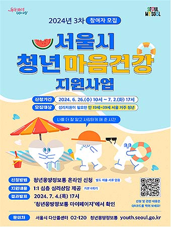 일상에서 불안, 우울감 등을 느끼며 심적으로 어려움을 겪는 청년들에게 전문적인 상담과 맞춤 프로그램을 제공하는 ‘서울시 청년 마음건강 지원사업’이 올해 3차 참여자 모집에 나선다.