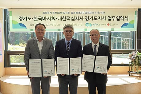 경기도는 지난 19일 반려마루 여주에서 한국마사회, 대한적십자사 경기도지사와 '유기·반려동물 물품꾸러미 지원사업' 업무협약을 맺고 돌봄취약가구의 반려동물 양육지원과 유기동물 입양 활성화 등에 협력하기로 했다.