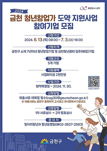 금천구(구청장 유성훈)는 오는 7월 3일까지 '금천 청년창업가 도약 지원사업' 공모에 참여할 청년창업기업 5개 사를 모집한다고 밝혔다.