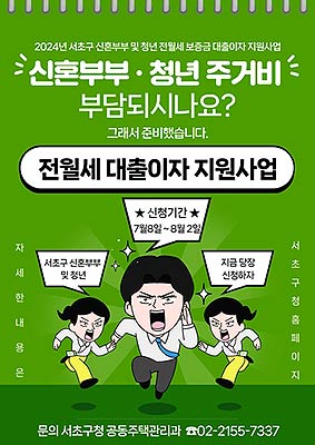 신청을 원하는 신혼부부와 청년은 서초구청 홈페이지를 통해 자세한 사항을 확인할 수 있고, 지원 서류를 구비해 신청기한 내에 서초구청 공동주택관리과에 방문 또는 우편으로 접수하면 된다.