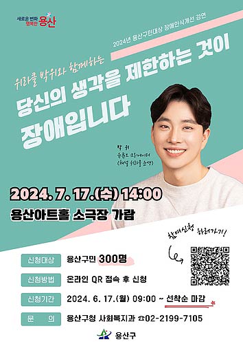서울 용산구(구청장 박희영)가 이달 17일 오후 2시 용산아트홀 소극장 가람에서 구민을 대상으로 위라클 팩토리 박위 대표를 초청하여 장애인식개선 강연을 개최한다.