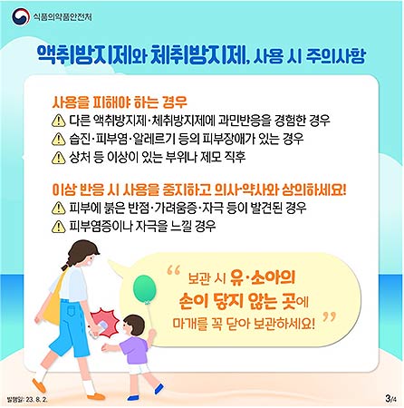 ➊다른 액취방지제·체취방지제에 과민반응을 경험했거나, ➋습진·피부염·알레르기 등이 있는 경우, ➌상처 등 이상이 있는 부위나, ➍제모 직후에는 액취방지제·체취방지제를 사용하지 말아야 한다.