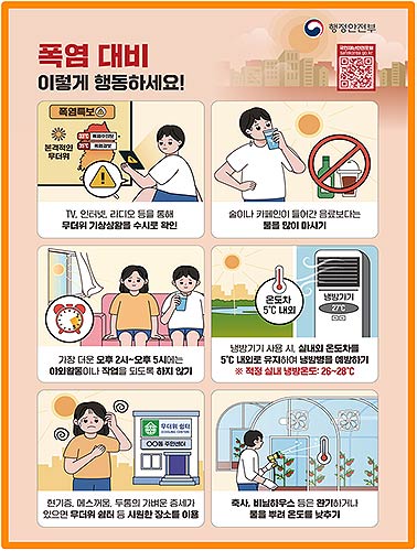 이한경 재난안전관리본부장은 “폭염 시 야외활동은 피하고 체감온도가 높아질수록 충분한 수분 섭취와 휴식으로 건강 먼저 챙겨야 한다”라며,“특히, 땡볕이 내리쬘 때 야외 작업은 물론, 논‧밭과 비닐하우스에서의 농사일은 매우 위험하니 가급적 자제하는 등 국민행동요령을 지켜 건강한 여름 보내시길 바란다”라고 말했다.