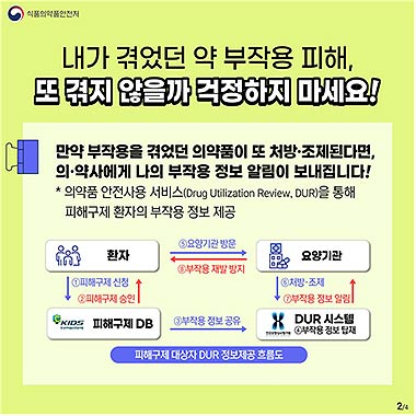 의약품 부작용을 경험한 환자가 동일·유사 계열의 의약품에 다시 노출되면 중증 부작용이 나타날 수 있다. 따라서 식약처·안전원·심평원은 ’20년 12월부터 DUR 시스템 내 환자별 부작용 데이터베이스(DB)를 구축하고 의료진에게 알림(팝업)창으로 피해구제를 받은 이력이 있는 환자의 부작용 정보를 제공해왔다.