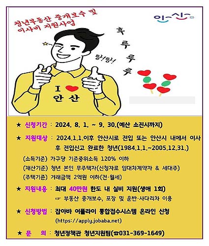 자세한 사항은 안산시청 누리집(홈페이지) 고시·공고란에서 확인하거나 청년정책관(031-369-1649)으로 문의하면 된다.