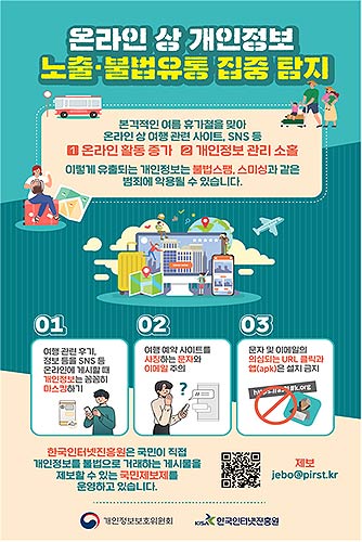 개인정보보호위원회(위원장 고학수, 이하 ‘개인정보위’)는 한국인터넷진흥원(원장 이상중, 이하 ‘인터넷진흥원’)과 함께 본격 여름 휴가철을 맞은 7월 29일(월)부터 8월 31일(토)까지 온라인상 개인정보 노출·불법유통 집중 탐지 기간을 운영한다고 밝혔다.
