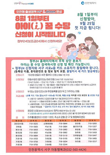 인천 서구(구청장 강범석)는 2024년 8월 1일부터 '아이 꿈 수당' 신청·접수를 시작한다고 밝혔다.