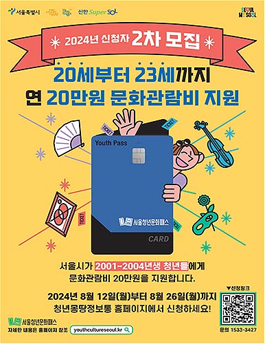 서울시는 20~23세 청년들의 문화예술 향유 기회를 확대하기 위한 <서울청년문화패스> 사업의 하반기 추가 참여자를 8.12.(월)~8.26.(월)까지 모집한다고 밝혔다.