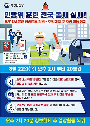 행정안전부(장관 이상민)는 적 공습 시 국민의 대응 역량을 강화하기 위해 오는 8월 22일(목) 오후 2시부터 20분간 민방위 훈련을 전국 동시에 실시한다고 밝혔다.