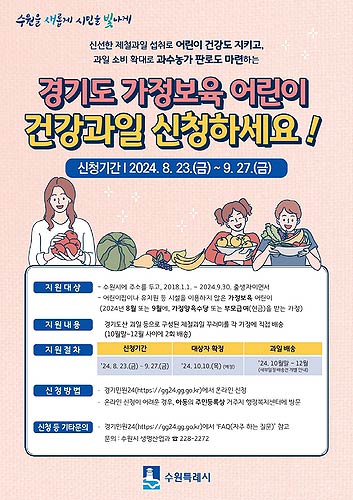 수원시(시장 이재준)가 오는 8월 23일부터 9월 27일까지 '2024년 경기도 가정보육 어린이 건강과일 지원사업'으로 과일 꾸러미를 받을 가정보육 어린이를 모집한다.