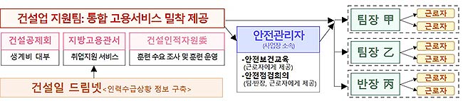 [고용서비스 사각지대 해소] 팀 단위로 일자리를 이동하는 건설 일용근로자 특성 감안하여 현장중심의 찾아가는 고용서비스 전달체계를 구축한다. 건설 현장 밀집지역에 지방고용노동관서, 건설공제회 등이 참여하는 ‘건설업 지원팀’을 운영하고, 현장 안전관리자와 협력하여 일용근로자에게 취업지원·직업훈련 등 고용서비스를 밀착 안내한다.