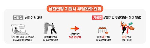 심사 후 지원이 결정되면, 최대 5년(60회차)까지 분할 상환기간이 추가로 부여된다. 예를 들어 당초 원리금 분할 상환기간인 3년인 경우에 5년을 추가하면 8년으로 전환되어 월 상환금액이 크게 줄어들 것으로 기대된다.