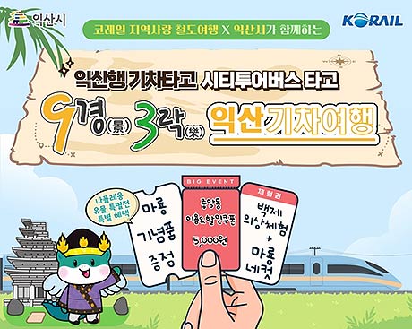 익산시는 코레일의 '다시 잇는 대한민국, 지역사랑 철도여행' 상품을 통해 익산 지정 열차를 예매하면 열차 운임을 최대 50%까지 할인받을 수 있다고 이달 16일 밝혔다.