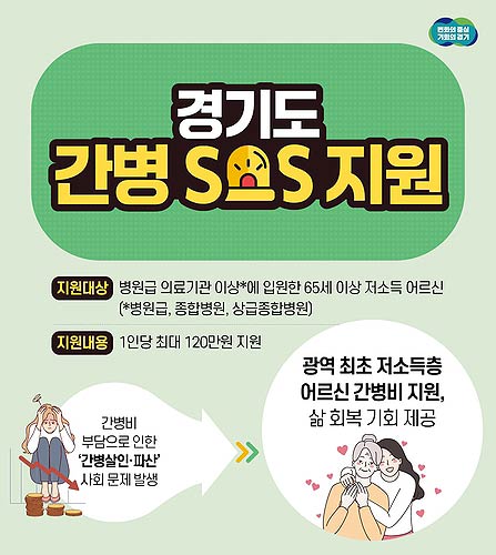경기도 간병 SOS 지원 사업은 국가 간병지원체계 마련 촉구를 위한 시범사업이다. 경기도에 거주하는 저소득층 중 상해·질병 등으로 병원급 의료기관 이상에 입원해 간병서비스를 받은 65세 이상 노인이 지원 대상이다.