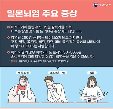 일본뇌염 바이러스에 감염되면 발열 및 두통 등 가벼운 증상이 나타나지만, 드물게 뇌염으로 진행되어 고열, 발작, 목 경직, 착란, 경련, 마비 등 심각한 증상이 나타나며, 이 중 20~30%는 사망할 수 있다. 특히 뇌염으로 진행될 경우 환자의 30~50%는 손상 부위에 따라 다양한 신경계 합병증을 겪을 수 있으므로 신속한 진단 및 치료가 중요하다.