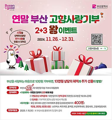 부산시(시장 박형준)는 오늘(26일)부터 12월 31일까지 36일간 고향 '부산광역시(시청)'에 기부하는 사람들에게 '5가지 혜택'을 제공하는 '연말 부산 고향사랑기부 2+3 왕 이벤트'를 추진한다고 밝혔다.