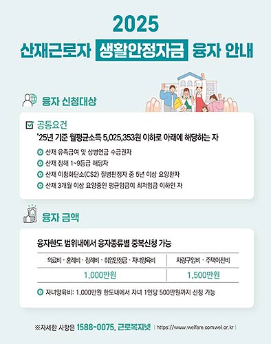 기존 산재근로자 생활안정자금 융자사업은 3인 가구 기준 중위소득(월 5,025,353원) 이하의 산재근로자 중 ▲산재장해 제1~9급 ▲유족급여 또는 상병보상연금 수급자 ▲이황화탄소(CS2) 중독으로 5년 이상 요양 중인 사람 등에게 의료비, 혼례비, 장례비, 차량구입비, 주택이전비, 취업안정자금 등 생계형 자금을 연간 150억 규모로 지원해 왔다.