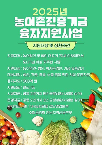 전라남도는 농어업인 경쟁력 강화와 농어촌 지역경제 활성화를 위해 농어촌진흥기금 500억 원을 1% 금리로 융자 지원키로 하고, 오는 24일까지 읍면동서 사업 대상자를 접수한다고 밝혔다.