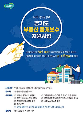 2020년 1월부터 시행된 경기도 부동산 중개보수 지원사업은 도내 국민기초생활수급자를 대상으로 거래가격 2억 원 이하 주택 매매 및 전·월세 계약 시 지불한 중개수수료를 최대 30만 원까지 지원하는 제도다.