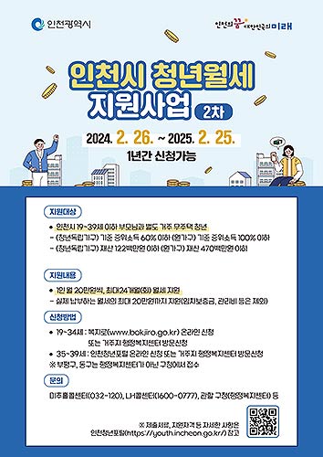 인천광역시는 경제적으로 어려움을 겪고 있는 청년들에게 월 20만 원씩 24개월 동안 최대 480만 원의 월세를 지원하는 ‘청년월세 지원사업’ 2차 신청자를 오는 2025년 2월 25일까지 모집한다고 밝혔다.