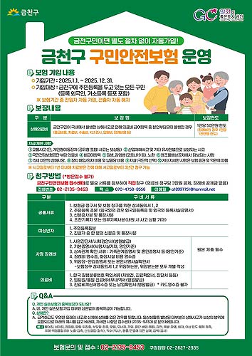 자세한 사항은 구민안전보험 접수센터(☏02-2135-9453) 또는 금천구청 주민안전과(02-2627-2935)로 문의하면 안내받을 수 있다.