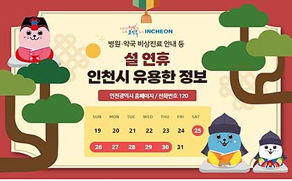 이외에도 22개 전통시장 주변 주정차 한시적 허용, 농축산물 도매시장 개장 정보, 문화예술 행사 등 설 연휴 기간 시민들에게 유용한 정보는 인천광역시 누리집에서 확인할 수 있다.