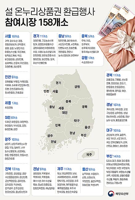 해양수산부는 설 명절 소비자 물가부담 완화를 위해 1월 23일(목)부터 27일(월)까지 전국 158개 전통시장에서 ‘설맞이 전통시장 온누리상품권 환급행사’를 개최한다.