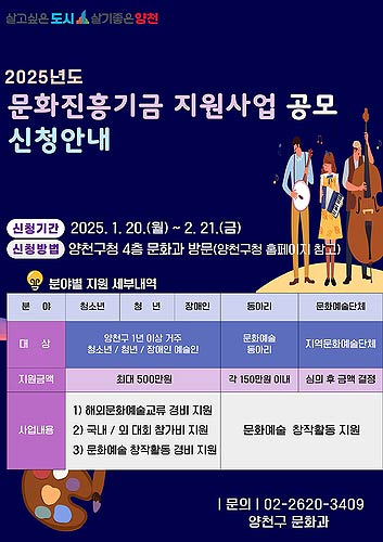 신청 자격은 공고일(1월 20일) 기준 1년 이상 양천구에 주소를 두고 문화예술분야 활동 실적이 2건 이상인 개인과 단체로, 지원 분야별 1개 사업만 신청할 수 있다. 신청을 희망할 경우 구청 홈페이지를 참고해 관련 서류를 작성한 후 이달 21일까지 구청 문화과로 방문 제출하면 된다.
