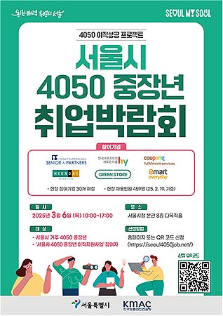 서울시는 3월 6일(목) 시청 본관 8층 다목적홀에서 ‘2025 서울시 4050 중장년 취업박람회’를 개최한다고 밝혔다. 인구절벽의 시대, 주요 경제활동인구인 중장년 세대의 인생 전환기를 지원한다는 취지다.