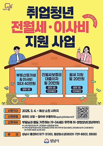 성남시는 사회초년생의 주거 안정을 돕기 위해 '취업 청년 전월세·이사비 지원사업(옛 주거 안심 패키지)'을 시행한다고 4일 밝혔다.