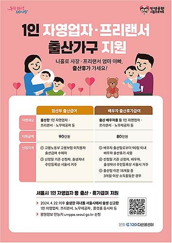 서울시가 처음으로 시행하는 ‘1인 자영업자 등 배우자 출산휴가급여 지원’으로 출산한 배우자를 둔 1인 자영업자, 프리랜서, 노무제공자, 플랫폼 종사자 아빠는 ‘배우자 출산휴가급여’ 최대 80만 원을 받게 된다. 소득수준과 무관하게 신청할 수 있으며 배우자 출산일 이전 18개월 중 3개월 이상 소득활동이 있을 경우 지원한다.