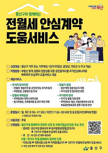 서울 용산구가 부동산 계약에 어려움을 겪는 1인 가구를 지원하기 위해 '1인 가구 전·월세 안심계약 도움서비스'를 확대 운영한다. 이는 부동산 계약 과정에서 발생할 수 있는 각종 피해를 예방하고, 구민들의 안전한 거래를 돕기 위해 추진됐다.