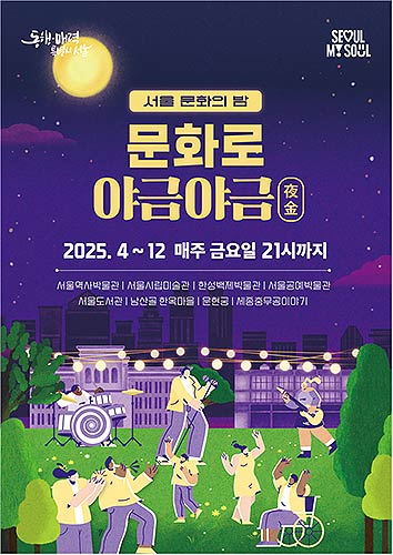 특히 시민 참여를 유도하는 ‘참여형 프로그램’ 확대에 중점을 둔다. 각 시설의 특성을 반영한 퀴즈 이벤트, 포토존, 공예체험 등으로 시민들이 더 오래 머물 수 있도록 하고 관람의 재미를 더하고자 한다. 이와 함께 계절, 트렌드에 맞는 이슈형 테마 프로그램도 다양하게 마련할 계획이다. 음악공연, 역사강연, 전시, 마술·서커스 등 다양한 문화 콘텐츠가 금요일 밤마다 서울 곳곳에서 펼쳐질 예정이다.