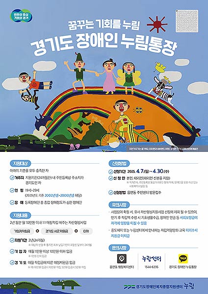 한편 이번 누림통장 홍보 포스터에 삽화는 자폐성장애인 미술가인 최명은 작가의 ‘자전거타기는 즐거워 2’와 ‘피터팬과 네버랜드 여행’으로 정했다. 작가는 ‘경기도 누림통장’을 통해 청년들이 네버랜드와 같은 즐거움이 가득한 꿈을 키워 나가기를 바란다고 전했다.