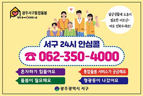 '24시 안심콜'은 스마트돌봄정보센터 전화(062-350-4000) 한 통으로 접수부터 상담, 처리까지 원스톱 서비스가 가능하며 접수된 내용은 담당부서와 돌봄지원기관, 소방과 경찰서 등에 실시간으로 공유해 신속한 대응과 맞춤형 돌봄서비스를 지원한다.