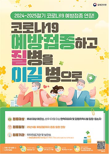 질병관리청은 코로나19 고위험군을 대상으로 중증·사망 예방을 위해 2024-2025절기 코로나19 예방접종을 6월 30일(월)까지 연장하여 실시하고 있다.