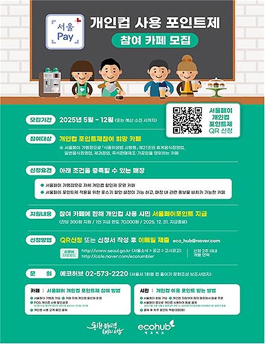 ‘서울페이 개인 컵 포인트제’ 참여를 원하는 매장은 공고문과 포스터에 기재된 QR코드를 통해 사업자등록증을 포함한 신청서를 제출하거나, 서울시 보조사업자의 전자우편(eco_hub@naver.com)으로 공고문의 신청서와 사업자등록증을 제출하면 된다.