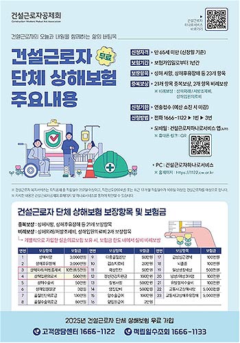 또한, 혹서기 발생할 수 있는 온열질환 등 각종 상해 사고를 대비하여 건설근로자를 대상으로 상해보험 무료 가입을 지원한다. 21일부터 내달 20일까지 상해보험 가입 신청자 중 100명을 무작위로 추첨하여 ‘배달의민족 상품권(5천원)’을 지급하는 이벤트도 운영한다.