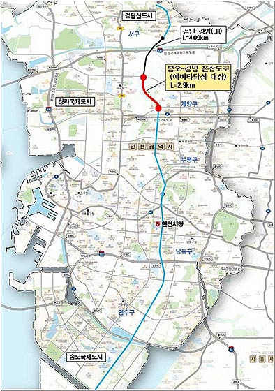 • 인천광역시는 인천 북부의 검단지역과 남부의 송도지역을 연결하는 신규 남북 간선축의 핵심 도로인 '봉오-경명 혼잡도로 건설사업'이 제2차 예비타당성조사 대상 사업으로 선정됐다고 20일 밝혔다.