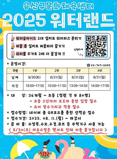 서울 용산구는 '약자와의 동행' 일환으로 오는 8월 30일부터 31일까지 이틀간 용산구문화체육센터(백범로 350) 수영장에서 '2025 워터랜드' 행사를 개최한다고 밝혔다.