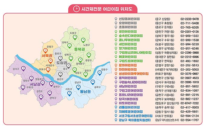9월부터 신규 운영하는 7개소는 ▴종로구 초동어린이집 ▴성동구 구립왕십리하나어린이집 ▴동대문구 메꽃어린이집 ▴중랑구 구립 드림어린이집 ▴마포구 삼성아이마루어린이집 ▴영등포구 아토어린이집 ▴서초구 서초구립 서초성모어린이집이다.