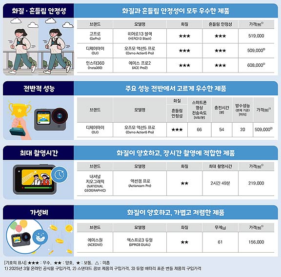 시험평가 결과, 화질·흔들림 안정성·최대 사용시간 등 주요 성능에서 제품 간 차이가 있었고 일부 제품은 최대 화각·방수 성능이 표시·광고 내용과 달라 개선이 필요했다.