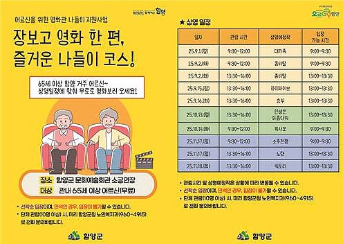 경남 함양군은 관내 65세 이상 어르신들의 문화생활을 지원하기 위해 오는 9월 1일부터 11월 18일까지 무료 영화 상영 서비스를 운영한다고 밝혔다.