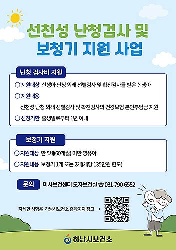 하남시는 영유아 선천성 난청을 조기에 발견하고 적절히 치료할 수 있도록, 소득과 관계없이 선천성 난청 조기검사비 및 보청기 구입비를 지원하고 있다고 밝혔다. 이번 사업은 아이들의 언어와 인지 발달을 돕고, 건강한 성장을 지원하기 위한 것이다.