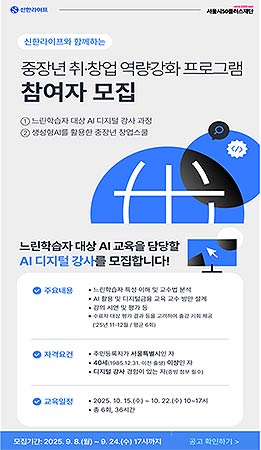 AI 교육이 사회 전반에서 주요 화두로 떠오르는 가운데, 서울시가 중장년층을 위한 맞춤형 AI 역량 강화 프로그램을 시작한다. 디지털 강사 과정과 생성형 AI 창업스쿨을 통해 40세 이상 시민이 새로운 기회와 경쟁력을 확보하도록 지원한다. 총 80명을 모집하며 참가비는 전액 무료다. 접수는 9월 8일(월)부터 순차적으로 시작된다.